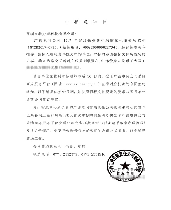 特力康中標國網(wǎng)黑龍江送變電工程公司的2024年度第18次物資類競爭性談判采購項目——慶陽驅(qū)鳥器物資框 特力康中標國網(wǎng)甘肅省電力公司省管產(chǎn)業(yè)單位2024年第五次物資競爭性談判授權(quán)采購項目 中標喜訊:深圳市特力康科技有限公司成功入圍許繼集團綜合能源公司輸電線路視頻在線監(jiān)測裝置模塊集采項目 中標喜訊:特力康成功中標國網(wǎng)重慶市電力公司渝中一片區(qū)項目 特力康成功中標國網(wǎng)天津市電力公司2024年第二次?物?資招標項目 特力康中標國網(wǎng)安徽省電力有限公司蕪湖供電公司2024年3月非物質(zhì)采購項目 戈壁林區(qū)的 “火情哨兵”:特力康紅外熱成像裝置守護甘肅輸電線路 內(nèi)蒙電網(wǎng)裝上 “舞動監(jiān)測眼”:特力康輸電線路防舞動監(jiān)測系統(tǒng)守護線路安全 浙江電力裝上“氣象哨兵”:特力康裝置守護電網(wǎng)應(yīng)對臺風暴雨 蜀道巡線不用“爬”:特力康視頻在線監(jiān)測裝置守護四川輸電鐵塔 風雪中的 “防冰哨兵”:內(nèi)蒙古電力用特力康監(jiān)測系統(tǒng)筑牢覆冰防線 雙軸感知護塔穩(wěn):山西電力用特力康裝置破解采空區(qū)傾斜難題 江西電力裝上 “智能防鳥衛(wèi)士”—— 特力康綜合激光驅(qū)鳥器破解湖區(qū)變電站鳥害難題 破解巡檢難題:貴州電力用特力康 AI 微拍裝置,精準捕捉線路隱性隱患 精準捕捉 “微氣象”:浙江電力用特力康預(yù)警系統(tǒng)筑牢電網(wǎng)氣候防線 守護 “電力咽喉”:湖南電力投用百套特力康三跨 4G 監(jiān)控球,筑牢安全防線 貴州電力裝特力康電網(wǎng)架空線路覆冰監(jiān)測系統(tǒng),精準防冰保電網(wǎng)過冬? 寧夏配電線路安裝了我司防外破電子化智能警示牌