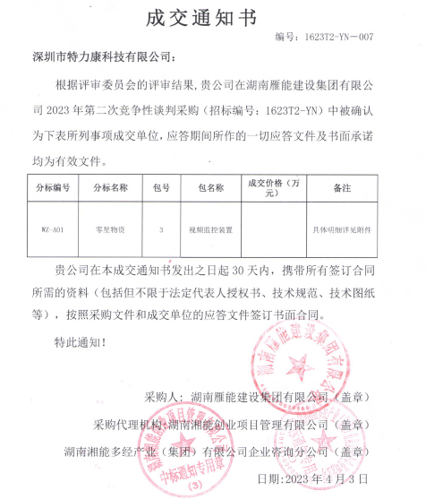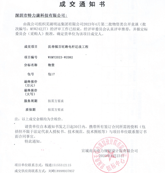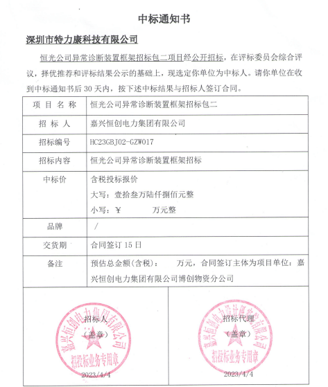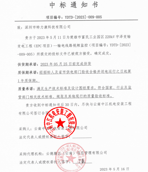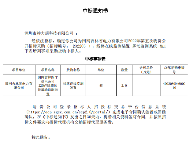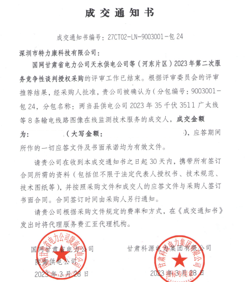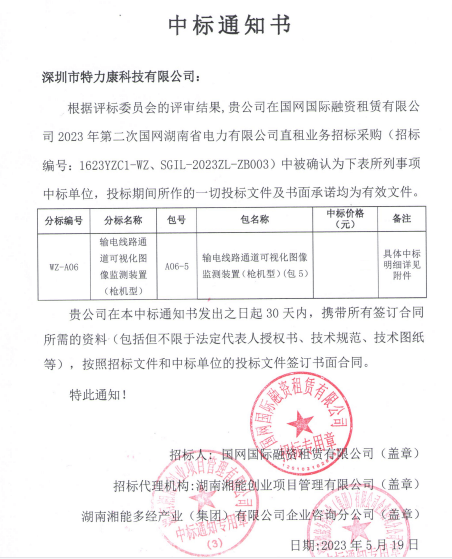 特力康中標(biāo)國(guó)網(wǎng)黑龍江送變電工程公司的2024年度第18次物資類競(jìng)爭(zhēng)性談判采購(gòu)項(xiàng)目——慶陽(yáng)驅(qū)鳥器物資框 特力康中標(biāo)國(guó)網(wǎng)甘肅省電力公司省管產(chǎn)業(yè)單位2024年第五次物資競(jìng)爭(zhēng)性談判授權(quán)采購(gòu)項(xiàng)目 中標(biāo)喜訊:深圳市特力康科技有限公司成功入圍許繼集團(tuán)綜合能源公司輸電線路視頻在線監(jiān)測(cè)裝置模塊集采項(xiàng)目 中標(biāo)喜訊:特力康成功中標(biāo)國(guó)網(wǎng)重慶市電力公司渝中一片區(qū)項(xiàng)目 特力康成功中標(biāo)國(guó)網(wǎng)天津市電力公司2024年第二次?物?資招標(biāo)項(xiàng)目 特力康中標(biāo)國(guó)網(wǎng)安徽省電力有限公司蕪湖供電公司2024年3月非物質(zhì)采購(gòu)項(xiàng)目 戈壁林區(qū)的 “火情哨兵”:特力康紅外熱成像裝置守護(hù)甘肅輸電線路 內(nèi)蒙電網(wǎng)裝上 “舞動(dòng)監(jiān)測(cè)眼”:特力康輸電線路防舞動(dòng)監(jiān)測(cè)系統(tǒng)守護(hù)線路安全 浙江電力裝上“氣象哨兵”:特力康裝置守護(hù)電網(wǎng)應(yīng)對(duì)臺(tái)風(fēng)暴雨 蜀道巡線不用“爬”:特力康視頻在線監(jiān)測(cè)裝置守護(hù)四川輸電鐵塔 風(fēng)雪中的 “防冰哨兵”:內(nèi)蒙古電力用特力康監(jiān)測(cè)系統(tǒng)筑牢覆冰防線 雙軸感知護(hù)塔穩(wěn):山西電力用特力康裝置破解采空區(qū)傾斜難題 江西電力裝上 “智能防鳥衛(wèi)士”—— 特力康綜合激光驅(qū)鳥器破解湖區(qū)變電站鳥害難題 破解巡檢難題:貴州電力用特力康 AI 微拍裝置,精準(zhǔn)捕捉線路隱性隱患 精準(zhǔn)捕捉 “微氣象”:浙江電力用特力康預(yù)警系統(tǒng)筑牢電網(wǎng)氣候防線 守護(hù) “電力咽喉”:湖南電力投用百套特力康三跨 4G 監(jiān)控球,筑牢安全防線 貴州電力裝特力康電網(wǎng)架空線路覆冰監(jiān)測(cè)系統(tǒng),精準(zhǔn)防冰保電網(wǎng)過冬? 寧夏配電線路安裝了我司防外破電子化智能警示牌