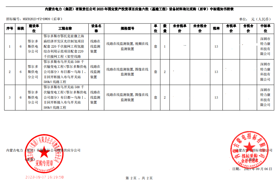 內(nèi)蒙古電力(集團(tuán))有限責(zé)任公司物資供應(yīng)分公司的采購(gòu)項(xiàng)目,于2023年08月24日開標(biāo)并已完成評(píng)審工作,同時(shí)向采購(gòu)人提交了該項(xiàng)目采購(gòu)情況的書面報(bào)告,現(xiàn)確認(rèn)我單位為成交單位,中標(biāo)通知如下:
