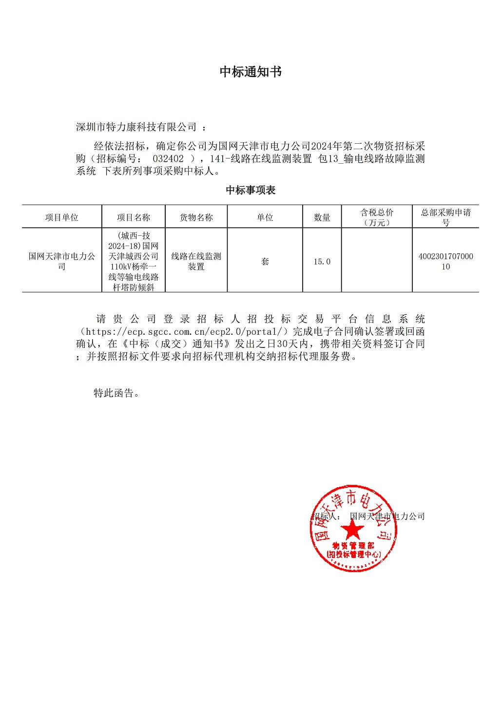 2024年4月18日——深圳市特力康科技有限公司(特力康)宣布,我司已中標國網天津市電力公司2024年第二次物資招標采購項目中的141-線路在線監測裝置包13_輸電線路故障監測系統。
