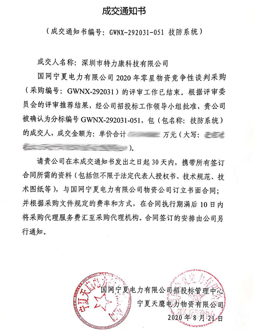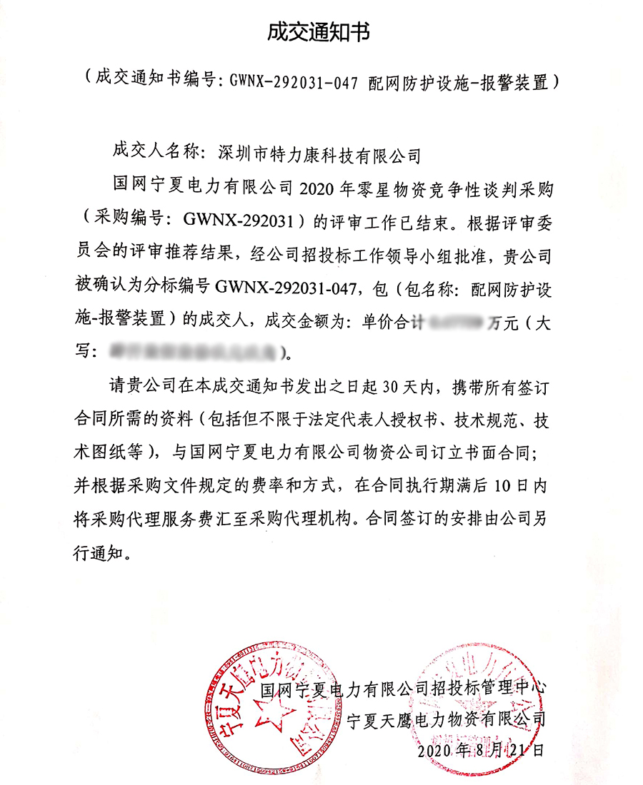 國網(wǎng)寧夏電力有限公司2020年零星物資競爭性談判采購(采購編號: GWNX-292031)的評審工作已結(jié)束。根據(jù)評審委員會的評審?fù)扑]結(jié)果,經(jīng)招投標工作領(lǐng)導(dǎo)小組批準,我司(深圳市特力康科技有限公司)被確認為分標編號GWNX-292031-047,包(包名稱:配網(wǎng)防護設(shè)施-報警裝置)及分標編號GWNX-292031-051,包(包名稱:技防系統(tǒng))的成交人,現(xiàn)發(fā)布成交通知書如下: