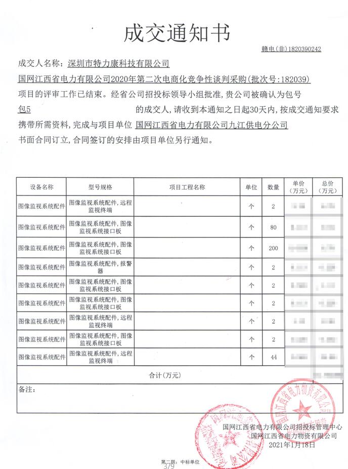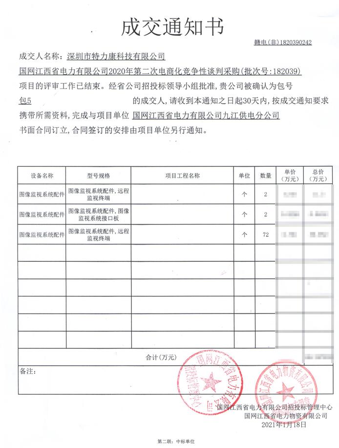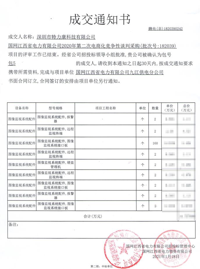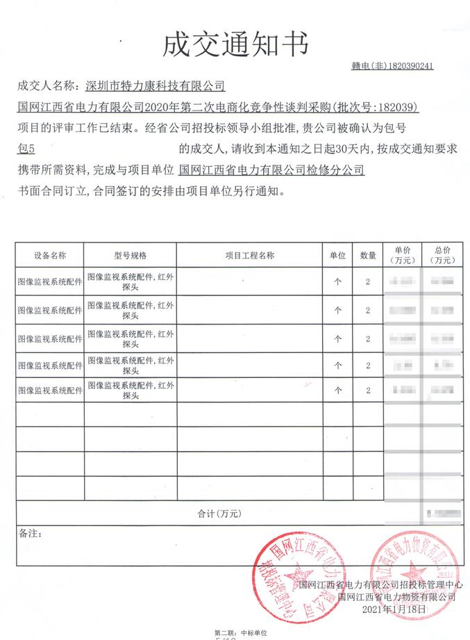 國網江西省電力有限公司2020年第二次電商化競爭性談判采購(批次號:182039)項目的評審工作已結束。經省公司招投標領導小組批準,我司(深圳市特力康科技有限公司)被確認為包號包5(圖像監視系統配件)的成交人,成交通知如下: