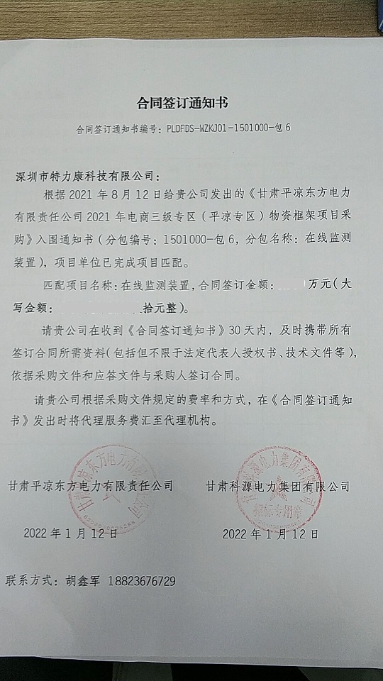 根據2021年8月12日給貴公司發出的《甘肅平涼東方電力有限責任公司2021年電商三級專區(平涼專區)物資框架項目采購》入圍通知書(分包編號: 1501000-包6, 分包名稱:在線監測裝置,項目單位已完成項目匹配。成交通知如下: