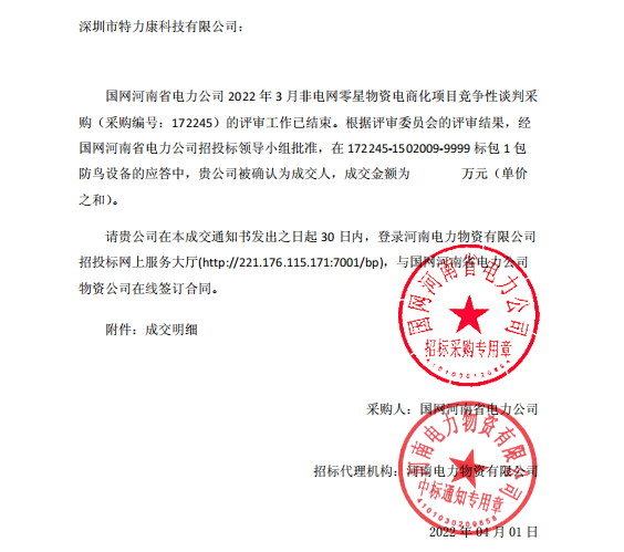 國網河南省電力公司2022年3月非電網零星物資電商化項目競爭性談判采購(采購編號: 172245)的評審工作已結束。根據評審委員會的評審結果,經國網河南省電力公司招投標領導小組批準,在172245-1502009-9999標包1包防鳥設備的應答中,我司被確認為成交人,成交通知如下:
