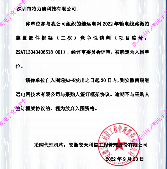 深圳市特力康科技有限公司:你單位參與我公司組織的繼遠電網(wǎng)2022年輸電線路微拍裝置部件框架(二次)競爭性談判(項目編號:22AT13043406518- 001) ,經(jīng)評審委員會評審,被確定為入圍單位。中標通知如下: